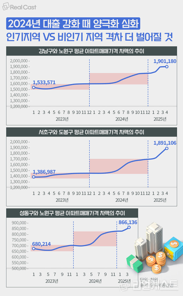 실제로 지난 2023년 1월부터 올해 4월까지 강남구와 노원구, 서초구와 도봉구, 성동구와 노원구의 평균매매가격 차이(예. 강남구 평균 가격에서 노원구 평균가격의 차액) 추이를 보면 스트레스 DSR 1단계(24년 2월)와 2단계(24년 9월)를 거치면서 가격차가 더 크게 벌어지는 것을 확인할 수 있습니다(출처: 한국부동산원).
