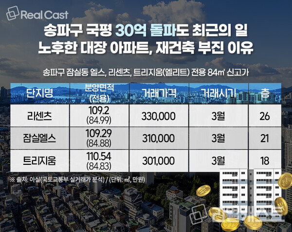 재건축 추진 중인 잠실주공5단지를 제외하고 잠실 대장아파트로 꼽히는 엘리트(잠실엘스, 리센츠, 트리지움) 아파트에서도 3월에서야 국평이 30억 원을 돌파했습니다. 의외로 30억 돌파가 늦었습니다.