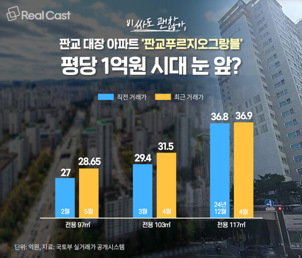 판교푸르지오그랑블 실거래가, 해당 면적 최고가 ‘경신 또 경신’