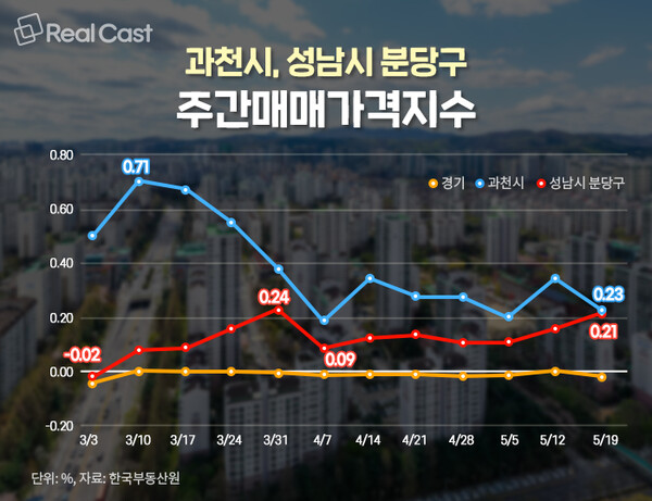 경기도에서 집값이 가장 많이 오른 과천시와 비교해 볼까요? 과천은 3월 둘째 주 0.71%로 크게 상승한 이후 4월 첫 주 0.19%, 5월 셋째 주 0.23%로 비슷한 변동률을 보이고 있는데요. 판교가 속한 성남시 분당구의 경우, 4월 첫째 주 0.09%에서 5월 셋째 주 0.21%까지 상승폭이 조금씩 커지는 모습을 확인할 수 있습니다.