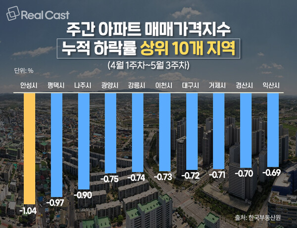 한국부동산원에 따르면, 4월 1주차부터 5월 3주차까지 안성시의 주간아파트 매매가격지수 변동률은 -1.04%를 기록해 같은 기간 전국에서 하락률 1위를 기록했습니다. 흥미롭게도 하락률은 2위는 안성 옆 도시인 평택시가 차지했습니다. 같은 반도체 도시인 이천시도 -0.73%로 큰 하락폭을 나타냈습니다.
