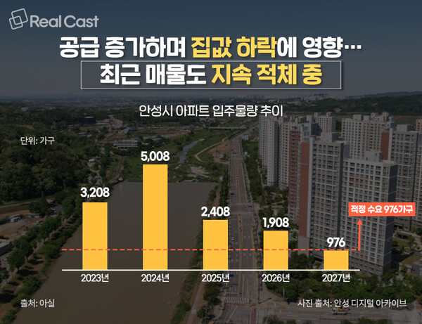 안성시의 하락은 공급 과잉에서도 찾아볼 수 있습니다. 아실에 따르면, 안성시의 연간 적정 수요는 976가구나, 올해 2,408가구를 비롯해 2026년 1,989가구 등 내년까지 공급 과잉이 지속되는 상태입니다. 다만 2027년 976가구를 끝으로 한동안 공급은 줄어들 것으로 보입니다.