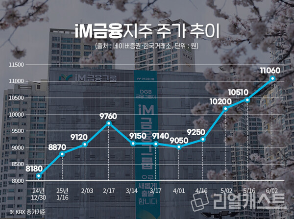 iM금융지주 주가는 지난 2일 종가(한국거래소) 기준 1만 1060원을 기록하며 전년 말 종가(8180원) 대비 35.29% 상승했습니다.