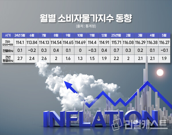 4일 통계청이 발표한 ‘2025년 5월 소비자물가동향’에 따르면 지난 5월 소비자물가지수는 116.27(2020=100)로 전년 동월(114.1) 대비 1.9% 올랐습니다. 올해 들어 1~4월까지 소비자물가 상승률은 2%대를 보였으나 지난해 12월(1.9%) 이후 5개월 만에 1%대로 내려온 것입니다. 5월 소비자물가지수는 당초 6월 3일 발표 예정이었으나 21대 대통령 선거일로 지정된 임시공휴일로 지정돼 하루 미뤄져 4일 발표됐습니다.