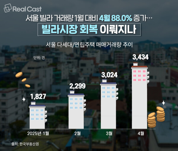 서울 빌라 거래량은 올해 1월 1,827건에서 2월 2,299건, 3월 3,024건, 4월 3,434건 등으로 지속 증가했는데요. 1월과 비교하면 4월에는 무려 88.0%나 급증한 것입니다.