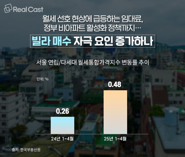 그뿐 아니라 최근 빌라시장에서는 월세 선호 현상이 확산되며 임대료 상승을 불러온 바 있습니다. 한국부동산원 월세통합가격지수에 따르면, 서울 빌라시장은 올해 1~4월 0.48% 오르며, 지난해 같은 기간 0.26%보다 2배가량 상승세를 나타냈습니다. 이에 정부의 빌라 활성화 정책까지 더해지며 투자 수요를 유입하는 데 영향을 미친 것으로 보입니다.