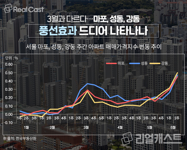 마포구는 6월 2주에 0.45%를 기록했는데 이는 2018년 2월 3주(0.45%) 이후 최고 상승률이며, 0.47%를 기록한 성동구는 지난해 8월 4주(0.55%) 이후 가장 높은 상승률을 기록했습니다.