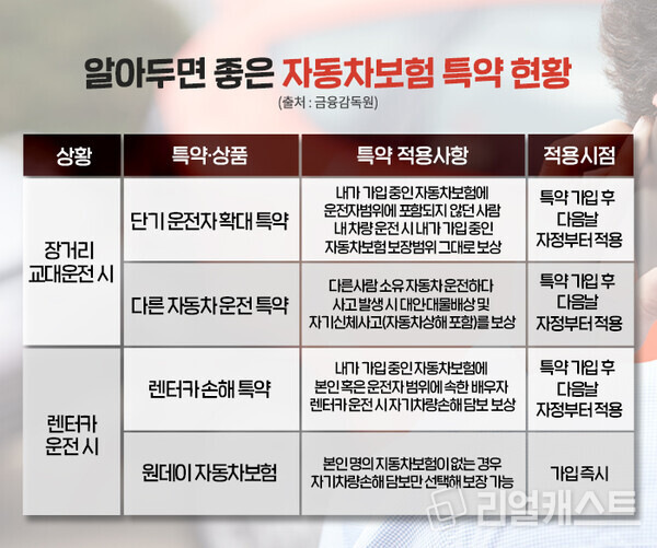 또한 보험사에 따라 특약 명칭과 보장조건 등이 상이할 수 있다보니 특약 가입 시 보험사와 상세한 상담을 받아 혹시나 모를 사고에 대비할 필요가 있습니다.