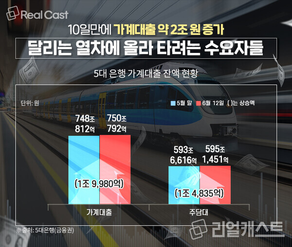 가계대출뿐만이 아니라 주담대(주택담보대출)도 전달보다 1조 4,835억 원 증가했습니다. 6월 말까지 간다면 증가액은 더욱 많아질 것으로 전망되고 있습니다.