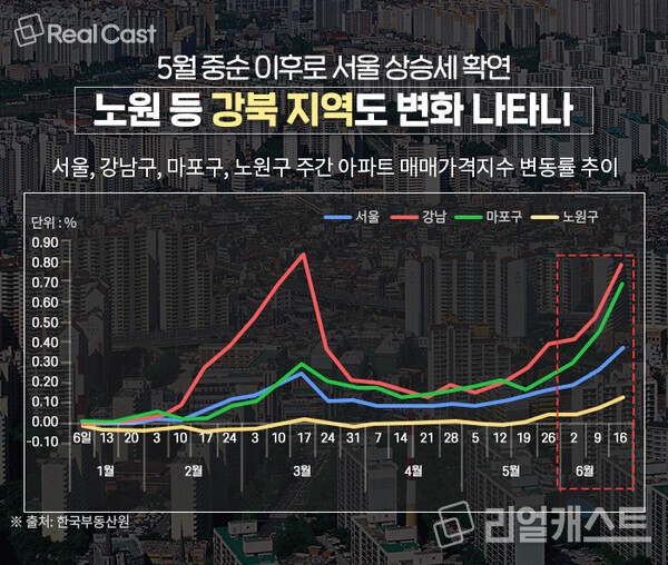강남 3구를 비롯해 도심의 마포구, 성동구 등의 상승이 거세지면서 노원구 등의 강북 지역도 6월 들어서 상승폭이 커지며 달라진 모습입니다.