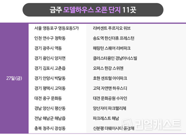 올 들어서 주중으로는 가장 많은 11개 단지의 모델하우스가 오픈 예정입니다. 권역별로 수도권 7곳, 지방 4곳 등입니다.