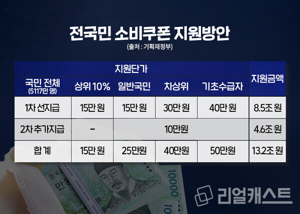 세부적으로는 소득 상위 10% 이상 국민에게 15만 원, 일반국민은 25만 원, 한부모가정 및 차상위계층에 40만 원, 기초수급자에게 50만 원이 지급됩니다. 농어촌 인구감소지역 주민에게는 1인당 2만 원을 추가 지급할 계획입니다.