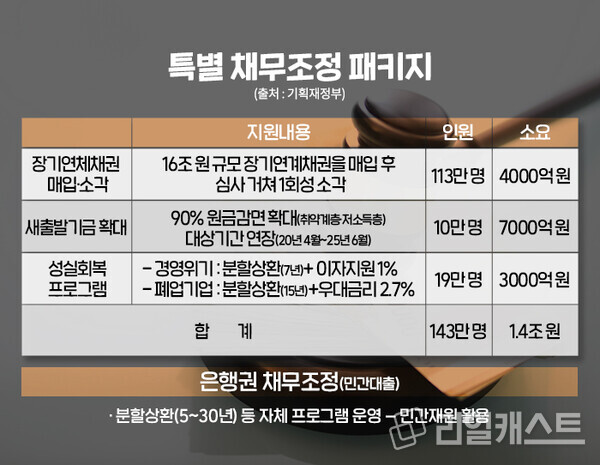 코로나19 등으로 인해 어려움을 겪고 있는 소상공인 등 취약차주 140만 명의 채무경감을 위해 1조 4000억 원을 투자해 특별 채무조정 패키지를 마련할 계획입니다.