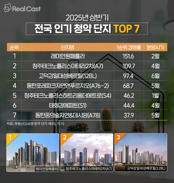 지방에서는 청주시 청주테크노폴리스아테라2차(A7) 109.7대 1로 가장 높았습니다. 같은 청주시 청주테크노폴리스하트리움더메트로(S4)도 46.2대 1로 마감됐습니다. 청주테크노폴리스 내 마지막 분양 단지인데다, SK하이닉스, LG생활건강 등 대기업 수요가 탄탄해 인기를 끌었습니다.