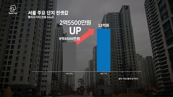 반포자이 전용 59㎡ 전세값은 12억5000만원. 일주일 사이에 5억원 이상 뛰었습니다. 마포자이 더 센트리지 국평도 10억3000만원으로 일주일 만에 3억원 이상 올랐습니다. 송파구 헬리오시티도 12억원까지 올랐습니다.