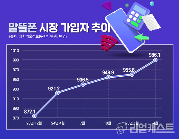 금융권 경쟁이 이어지고 있는 알뜰폰 시장 가입자는 4월 말 기준 986만 명을 넘어서며 증가추세가 이어지는 것으로 확인됐습니다. 지난해 12월 알뜰폰 시장 가입자가 소폭 줄어든 이후 올해 들어 매달 10만 명 이상 꾸준히 증가하고 있어 하반기 중 1000만 명을 돌파할 것으로 예상됩니다.