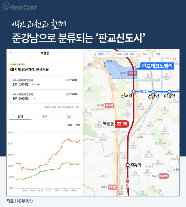 KB부동산에 따르면, 판교역이 위치한 백현동 아파트 평균 매매 시세는 22억1,031만원으로 강남구 역삼동 23억4,685만원보다 조금 낮고 과천시 중앙동 22억6,337만원과 비슷한 수준입니다. 이렇게 판교, 과천 집값이 강남 일부 지역과 비슷해진 이유는 강남 접근성과 지역 내 일자리 수요 때문으로 해석됩니다.