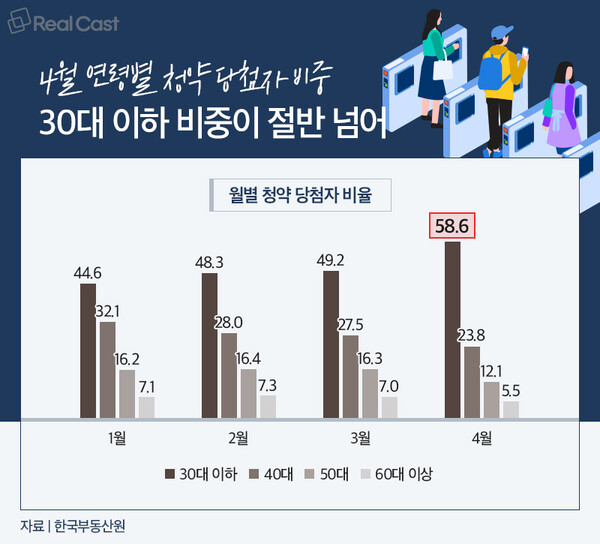 한국부동산원의 연령별 청약 당첨자 정보에 따르면, 4월 말 기준 30대 이하가 58.6%로 1월 44.6% 이후 꾸준히 늘며 전월 대비 9.5%p 증가했는데요. 이는 전체 당첨자의 절반 이상을 차지합니다. 40대는 23.8%, 50대 12.1%, 60대 이상 5.5%로 3040세대가 내 집 마련에 적극적으로 임하고 있는 것으로 해석할 수 있습니다.