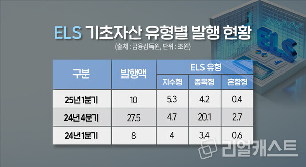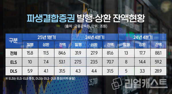 1분기 중 파생결합증권 발행액은 15조 8000억 원, 상환액은 11조 5000억 원으로 발행액이 상환액을 상회하다보니 파생결합증권 잔액은 1분기 말 기준 84조 6000억 원으로 24년말(81조 6000억 원)과 비교해 3조 원 늘어났습니다.