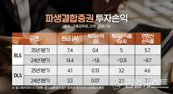 1분기 ELS·DLS 투자수익률은 각각 연 5.7%, 연 4.6%로 전년동기 대비 각각 14.4%, 1.9% 증가했습니다. ELS 투자수익률이 대폭 개선된 요인으로는 홍콩H지수 관련 ELS가 지난해 대부분 상한되면서 수익률이 손실에서 이익으로 전환됐습니다.