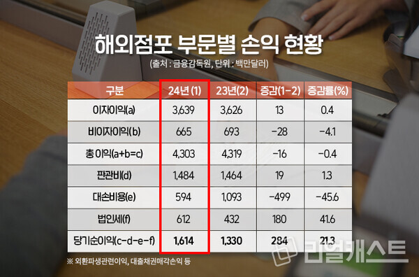 2조 2000억 원은 지난해 국내은행이 벌어들인 전체 당기순이익 22조 2000억원의 10.7%에 달하는 수치로 2023년에 기록한 8.1% 대비 해외점포 수익 비중이 2.6%p 늘어나며 해외점포가 차지하는 수익비중이 높아졌습니다.