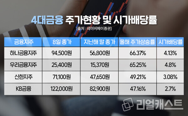 이처럼 배당소득 분리과세에 대한 기대감이 높아지면서 그 수혜주로 금융주들이 주목받으며 주가가 크게 오르고 있는 상황입니다. 4대금융주는 지난 8일 종가 기준으로 올해 들어서만 평균 56.99%가 상승하며 같은 기간 코스피 올해 상승률(29.81%)을 웃돌며 증시를 이끌고 있습니다.