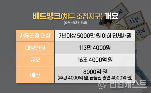 정부는 '장기 연체채권 채무조정 프로그램' 정책을 속도감 있게 추진하기로 했습니다. 이재명 대통령이 부실채권 정리에 강력한 의지를 드러내자, 금융당국은 당장 다음달 한국자산관리공사(이하 캠코) 산하에 '배드뱅크'를 설치하기로 하는 등 속도전에 나설 방침입니다.