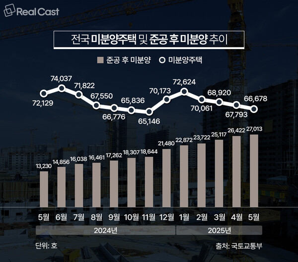 문제는 최근 악성 미분양이 점점 더 증가하는 추세라는 것입니다. 5월 기준 전국 악성 미분양은 2만7,013가구로 4월 2만6,422가구와 비교해 2.2% 증가했습니다. 전년 동기(1만3,230가구)와 비교해서는 무려 2배 이상 늘어난 수치입니다.