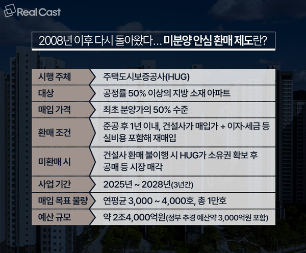 미분양 안심환매 사업이란, 주택도시보증공사(HUG)가 준공 전 미분양 아파트를 분양가 50% 수준으로 매입한 뒤, 준공 후 건설사에 다시 환매(재매각)하는 방식을 뜻합니다.
