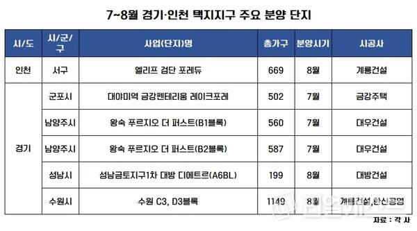 부동산정보업체 부동산인포에 따르면 7~8월 경기·인천에서 경기 평택, 남양주, 군포, 수원과 인천 검단 일대 택지지구에서 총 6.566가구가 분양할 계획이다. 이중 5,083가구가 일반분양 된다.