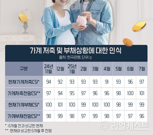 가계부채전망CSI는 96p로 6월과 비교해 1p 하락하며 6개월 후 가계부채 감소를 예상하는 소비자가 증가를 예상하는 소비자보다 많아졌다는 의미입니다.