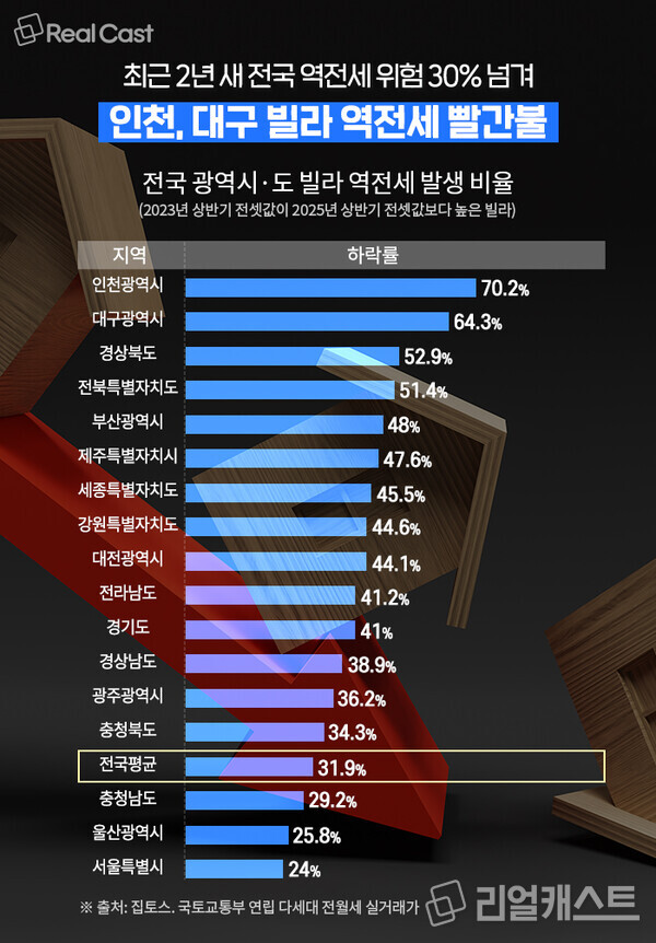 집토스에 따르면 2023년 상반기 대비 2025년 상반기 동일 면적 연립·다세대 전세 거래를 기준으로 전세 보증금이 하락한 거래 비율은 전국 평균 31.9%로 집계됐습니다.