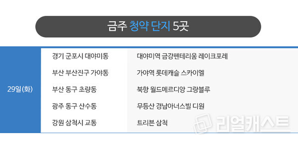 부동산인포에 따르면 7월 5주 청약에 나서는 곳은 5곳, 2100가구 입니다(총 가구수 기준).