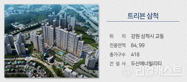 대한토지신탁이 시행하고 두산에너빌리티 시공하는 '트리븐 삼척'이 강원 삼척시 교동에서 분양합니다. 삼척시청, 삼척의료원, 홈플러스, 삼척중앙시장 등의 삼척 시내 다양한 생활인프라를 이용하기 쉽습니다. 동해대로, 동해고속도로, 7번국도 등으로 차량이동이 쉽습니다. 삼척초, 정라초, 청아중, 삼일중, 삼척고, 삼척여고, 강원대 삼척캠퍼스 등의 교육시설도 인접해 있습니다.