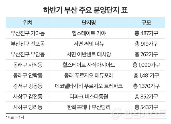 이외에 △수영구 835가구(1개 단지) △연제구 369가구(1개 단지) △남구 104가구(2개 단지) △사상구 852가구(1개 단지) △사하구 209가구(1개 단지) △동구 68가구(1개 단지) 등에서 각각 분양이 계획돼 있다.