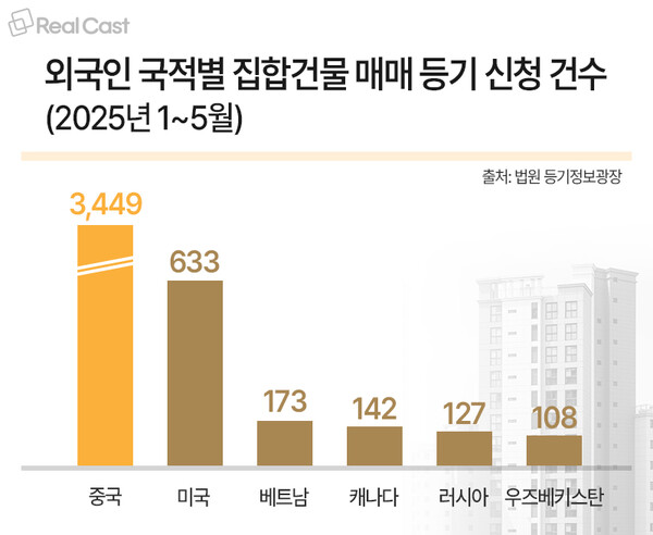 법원 등기정보광장에 따르면, 올해 상반기(1월~5월) 기준으로 외국인의 집합건물(아파트·빌라·상가) 소유권 이전(매매) 등기 신청 건수는 5,153건으로 집계됐습니다. 그중 중국인이 3,449건(66.9%)로 가장 많았던 것으로 집계됐습니다.