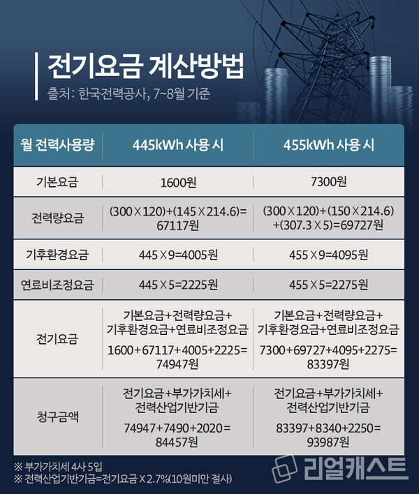 일례로 한 가정에서 7~8월에 월 전력 445kWh 사용 시 전기요금은 기본요금 1600원에 전력량요금 6만 7117원 기후환경요금 2225원을 포함해 8만 4460원입니다. 다만 10kWh를 더 사용해 월 전력 사용량이 455kWh가 된다면 누진 3단계에 진입하게 되면서 기본요금이 5700원 늘어나고 전력량요금도 오르면서 전기요금은 9만 3990원으로 11%이상 상승하게 됩니다.
