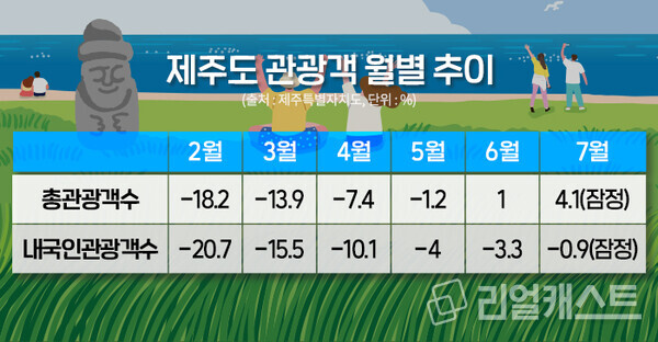 내국인관광객이 회복됨에 따라 제주도를 방문한 총 관광객수도 6월 전년 동월과 비교해 1% 늘었으며 7월에도 4.1%(잠정) 증가한 것으로 나타났습니다.