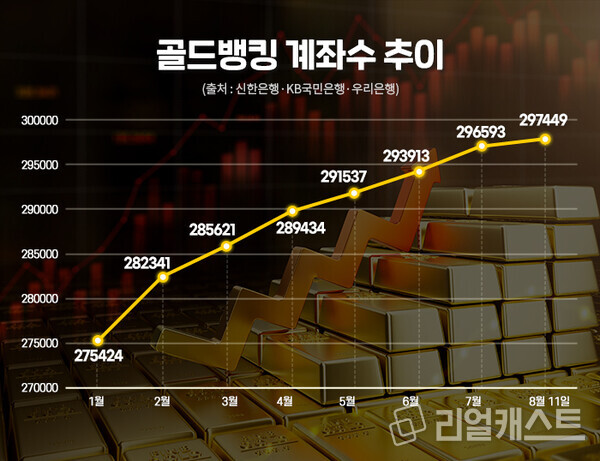 골드뱅킹 계좌수도 늘어나는 추세입니다. 1월 말 기준 27만 5424개에 불과했던 골드뱅킹 계좌수는 8월 11일 기준 29만 7449개로 2만 개 이상 많아진 것으로 확인됐습니다. 금값이 또다시 사상 최고치에 접근하면서 금에 쉽게 투자할 수 있는 은행 골드뱅킹 계좌개설이 늘어난 것으로 풀이됩니다.