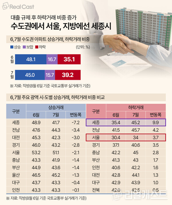 부동산 플랫폼 직방에 따르면 6·27 부동산 대출 규제 시행 후 7월 한 달 수도권 아파트의 하락 거래(종전 가격보다 낮은 가격의 거래) 비중은 39.2%로 나타났습니다. 이는 6월 한 달 전(35.1%)보다 4.1% 포인트 증가한 수준입니다. 반면, 상승 거래 비중은 48.1%에서 45.0%로 줄었습니다.
