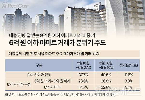 9억 원 이하 가운데 6억 원 이하 거래 비중은 14.7%에서 22.8%로 급등해 대출 압박에 처한 실수요자들이 저가 아파트로 눈을 돌린 것으로 보입니다.