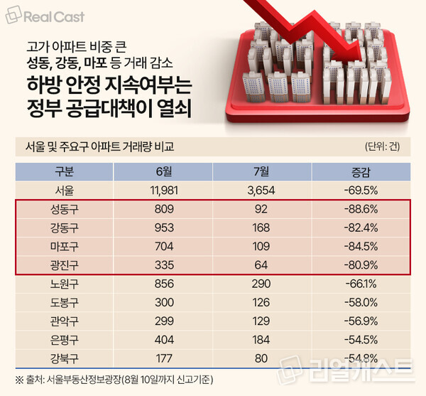 부동산인포가 서울부동산정보광장 아파트 거래량 데이터를 분석한 결과 성동구는 무려 88.6%가 감소했으며 강동구 82.4%, 마포구 84.5%, 광진구 80.9% 등으로 감소 폭이 컸습니다. 반면 노·도·강(노원구, 도봉구, 강북구)은 50~60% 수준의 감소 폭을 기록해 대조를 이뤘습니다.