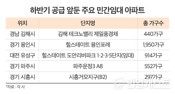 부동산시장 분석업체 부동산인포에 따르면 하반기 공급을 계획 중인 주요 민간임대 아파트로는 제일건설이 8월 김해시 진례시례지구 도시개발사업 B-3블록에 440가구 규모의 '김해 테크노밸리 제일풍경채'를 선보일 예정이다.