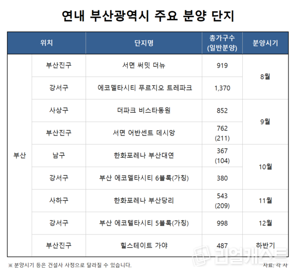 10월에는 한화건설부문이 남구에 '한화포레나 부산대연' 367가구(일반분양 104가구)를 공급하며, 11월에는 '한화포레나 부산당리' 543가구(일반분양 209가구)도 예정돼 있다.