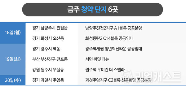 부동산인포에 따르면 8월 3주 청약에 나서는 곳은 6곳, 4,722가구 입니다(총 가구수 기준).