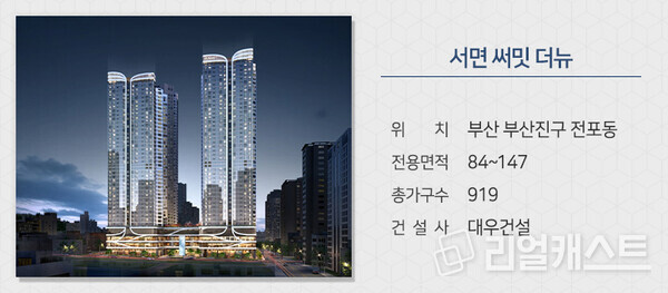 대우건설이 부산 부산진구 전포동에 짓는 '서면 써밋 더뉴'를 분양합니다. 옛 NC백화점 서면점 부지에 들어서 47층 높이의 하이엔드 주거 단지입니다. 부산지하철 1호선과 2호선 환승역인 서면역 역세권이며 2호선 전포역과 KTX와 동해선이 정차하는 부전역도 이용할 수 있습니다.