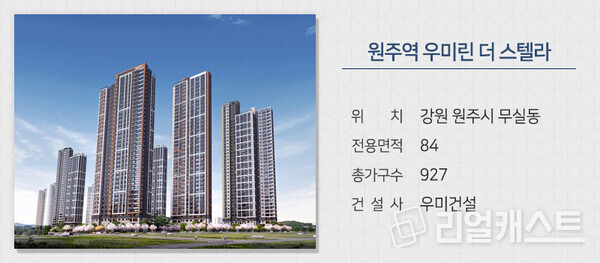 우미건설이 강원 원주시 무실동에 짓는 '원주역 우미린 더 스텔라'를 분양합니다. 남원주역세권 내에 민간 분양으로는 마지막 물량에 해당하며 앞서 분양에 성공한 단지와 함께 1,827가구의 우미린 브랜드 타운을 형성합니다.