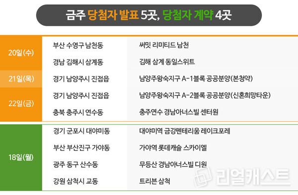 부산에서는 제2의 남천을 꿈꾸는 하이엔드 아파트가 분양하며 한국토지주택공사(LH) 공공분양도 청약에 나섭니다.