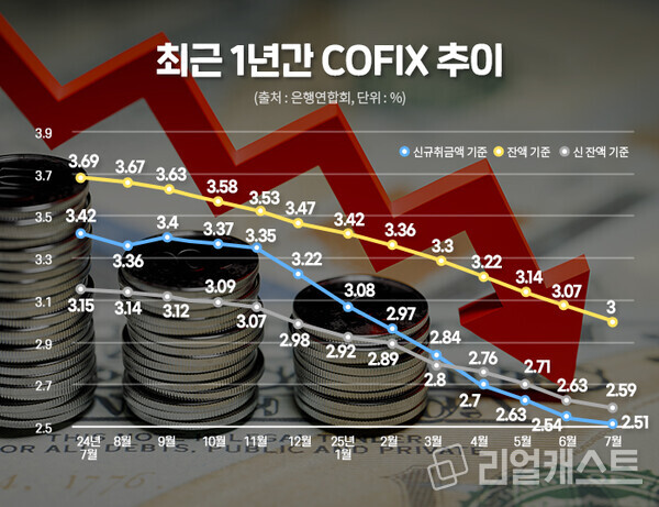 은행연합회가 지난 18일 발표한 7월 기준 코픽스 공시에 따르면 7월 신규 취급액 기준 코픽스는 2.51%로 집계되며 6월(2.54%) 대비 0.03%p 낮아진 것으로 확인됐습니다. 잔액기준 코픽스 역시 전달과 비교해 0.07% 하락한 3%로 나타났습니다.