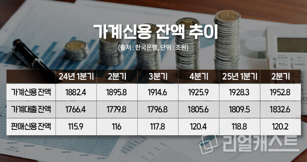 여기서 가계신용이란 금융기관(은행·상호저축은행·신용협동조합 등)에서 빌린 대출에 카드·할부금융사의 외상판매인 판매신용을 합친 것을 의미합니다.